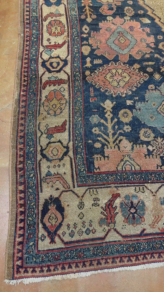 The color palette is rich yet beautifully aged, featuring a deep indigo-blue field layered with warm terracotta, soft salmon, muted teal, ivory, and subtle touches of rust and pale sky blue. These naturally dyed hues have mellowed over time, developing a refined patina that enhances depth and contrast without feeling overpowering. The confident drawing and robust wool construction reflect the durability and craftsmanship Serab rugs are known for.