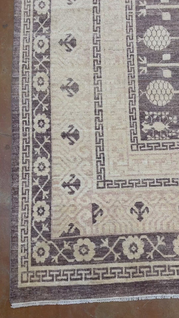 This Fine Khotan rug, measuring 9'10" x 14'1", is a striking example of the distinctive artistry and cultural fusion that defines classic Khotan weaving. Originating from East Turkestan along the historic Silk Road, Khotan rugs are celebrated for their graphic compositions, symbolic motifs, and balanced use of negative space.