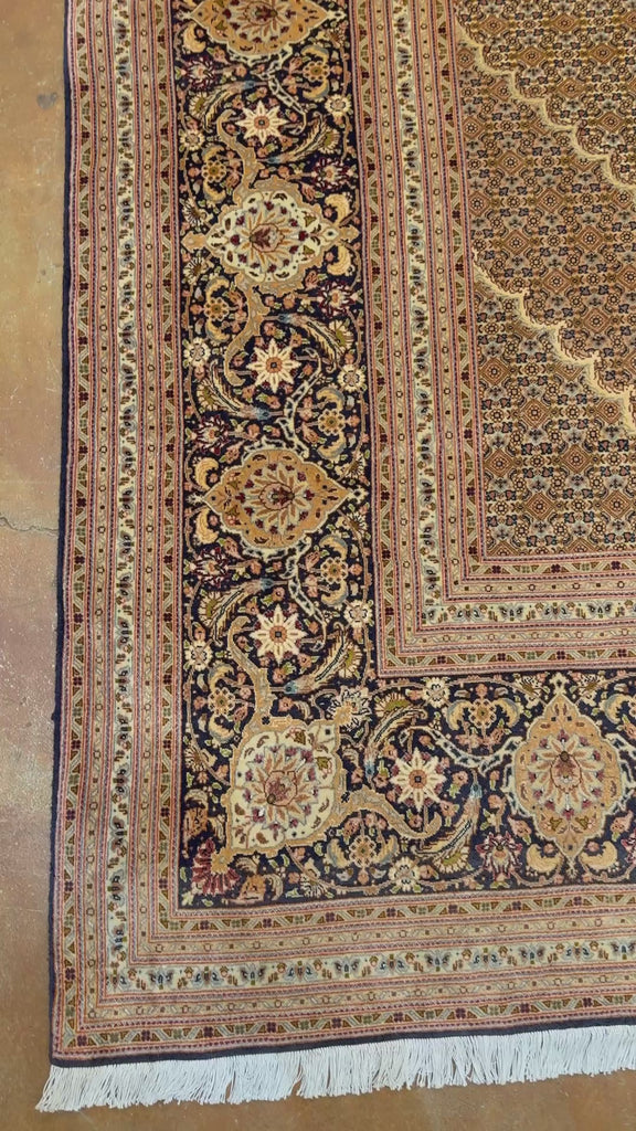 A deeply detailed floral border anchors the composition, introducing darker accents that provide contrast and definition while still maintaining an elegant, understated presence. Handwoven with extremely fine knotting and superb wool quality, this Tabriz Mahi offers a smooth, almost velvety handle and exceptional clarity of design—hallmarks of high-grade workshop production.