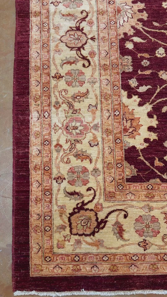 The palette is especially compelling: a deep, wine-toned ground balanced by luminous accents of parchment ivory, soft gold, blush, and subtle celadon. The wide, floral border—rendered in creamy neutrals with gentle pastel highlights—frames the rug beautifully, creating contrast while maintaining an overall sense of harmony and calm. Natural abrash throughout the field adds depth and movement, giving the surface a warm, living quality.