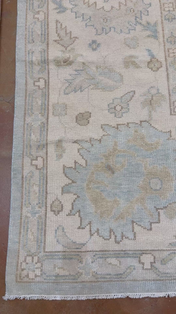 Soft, sun-washed, and quietly elegant, this Montecito Oushak is the definition of understated luxury. A pale, coastal palette of misty blue, warm ivory, soft sand, and whisper-light sage creates an airy foundation that feels effortless and serene. The traditional Oushak motifs—overscaled florals and gentle geometric forms—are rendered with a deliberately faded hand, giving the rug a relaxed, lived-in character from day one.