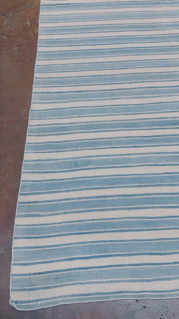 The color palette blends pale blue, soft sky, muted denim, and warm ivory, resulting in an airy, coastal-inspired appearance. Slight irregularities in the weave and stripe saturation add a handcrafted quality, enhancing depth without introducing bold contrast. The matte finish and natural texture make it an easy, versatile foundation for a wide range of interiors.